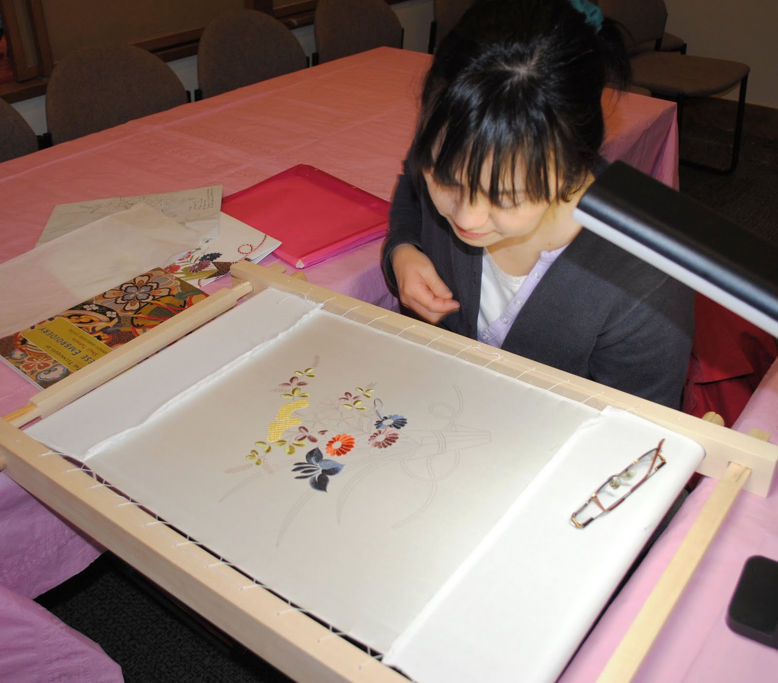 Every year at the festival there's a room dedicated to Japanese crafts. The day I was there they were demonstrating Japanese embroidery. I like how the embroidery frame is set between two tables so the artists' hands can be free. It seems like it would be easier to use compared to the hand held hoop.