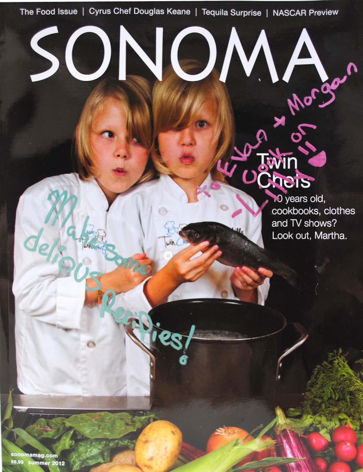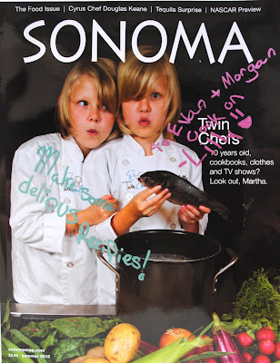Have you heard of the twin chefs Lilly and Audrey Andrews? I only recently learned about them after my mother gave us this signed copy of Sonoma Magazine. Lilly and Audrey are ten year old twins who love to cook. Their goal is to become the youngest children to attend cullinary school. They've made appearances on Good Morning America and Ellen. I found their story inspiring and charming. The article is a good read but if you can't get a copy of the magazine, you can find out more about the twins on their website, Twin Chefs.