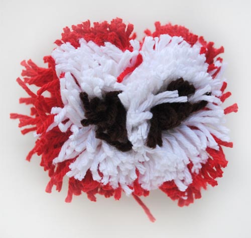 Big difference from the last picture, right? Here's where the finessing comes in. First I did trim the pom pom down to an apple shape. But then I realized that where the red and white met on top needed to have more of a widow's peak shape. Since the white part was receding too much, I had to trim down the white yarn much more than the red. Then I combed the red forward to overlap the white a little. I also had to trim the white yarn on the sides shorter than the red. Besides that, the seeds were too big. I had to cut out quite a few of the brown strands and push the white yarn over some of the brown yarn. While I was doing all this trimming, the white yarn was getting all over the red yarn and I had to keep picking it out.