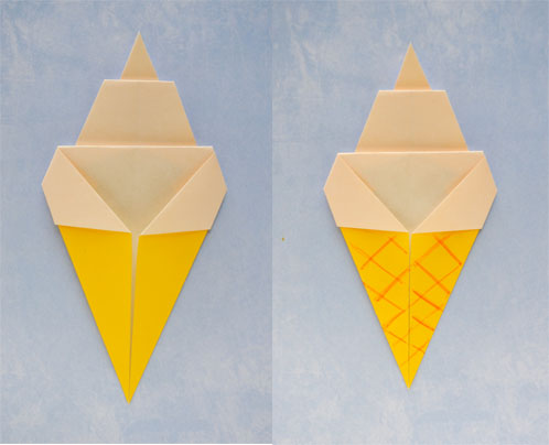 For different color combinations, fold with two pieces of paper stacked on top of each other. For example, start with a yellow and pink piece of paper to make a strawberry ice cream cone.