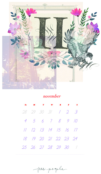 Does anyone else feel like the months are just flying by? I meant to share this calendar with you a week ago but just lost track of time. But since we have three weeks left, I figure it's still worth a post. Free People is offering this lovely November calendar to download for free. They also have some pretty desktop wallpaper up for grabs as well. You can get all the free downloads on their flickr page.