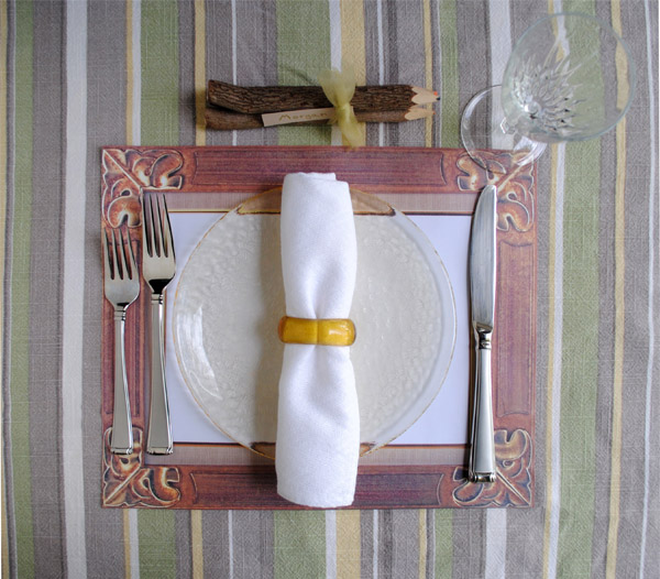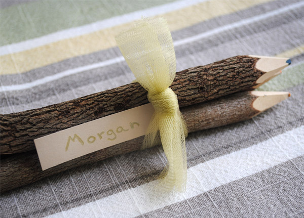 To finish off the place setting, take a couple colored pencils or crayons and secure them with ribbon. Then just tuck in a name tag. The colored pencils don't have to be fancy either. I used these twig pencils because that's what we had laying around the house. Good old fashioned crayons will work fine.